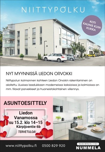 Ystävänpäiväviikonlopun asuntoesittely Liedon Vanamossa su 15.2. klo 14-15, Kärpijoentie 6b, Lieto